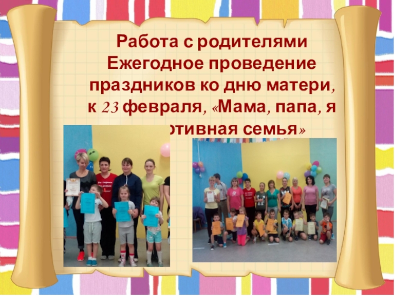 Работа с родителямиЕжегодное проведение праздников ко дню матери, к 23 февраля, «Мама, папа, я – спортивная семья»