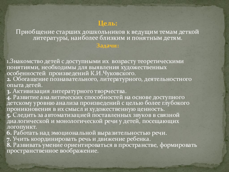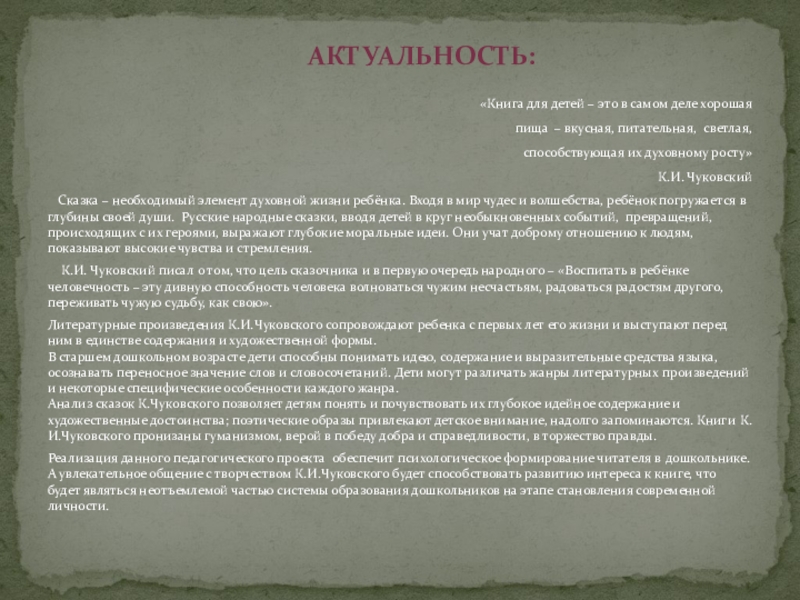 Литературные произведения К.И.Чуковского сопровождают ребенка с первых лет его жизни и выступают перед ним в единстве содержания и художественной формы.