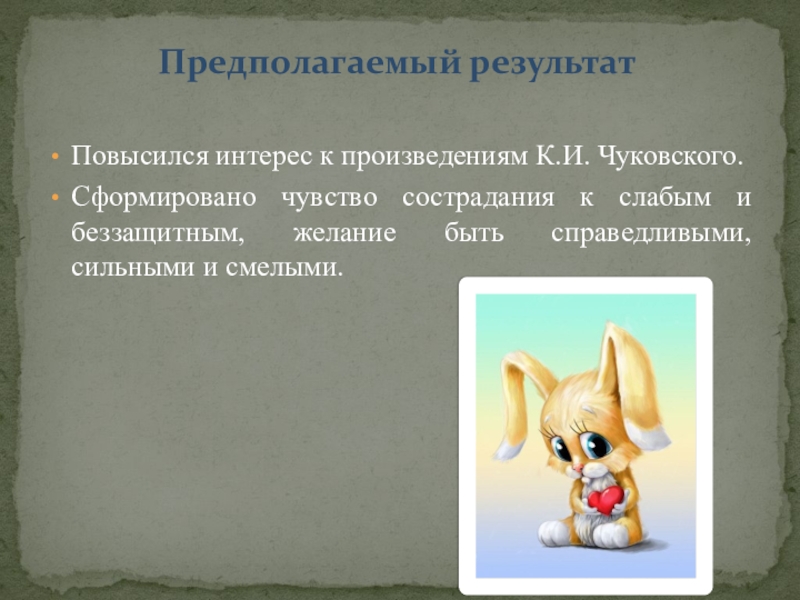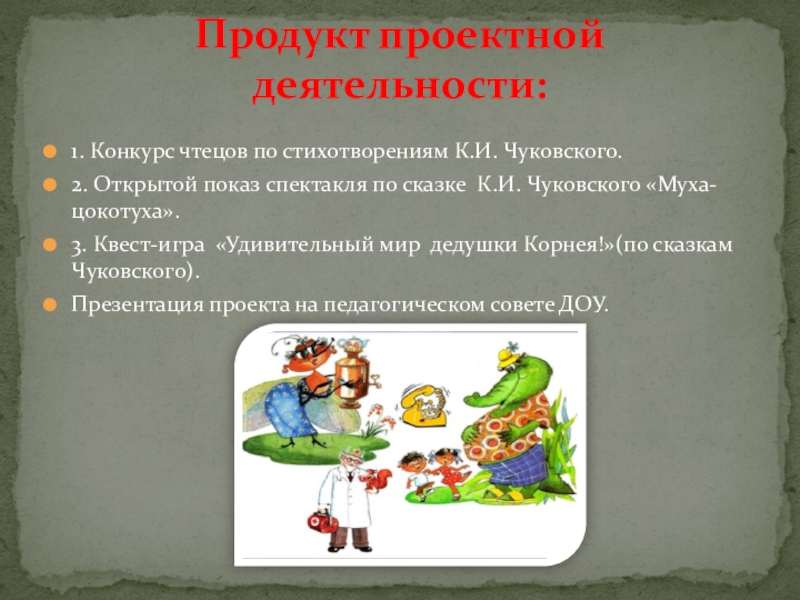 Реализация данного педагогического проекта обеспечит психологическое формирование читателя в дошкольнике. А увлекательное общение с творчеством К.И.Чуковского будет способствовать развитию интереса к книге, что будет являться неотъемлемой частью системы образования дошкольников на этапе становления современной личности.