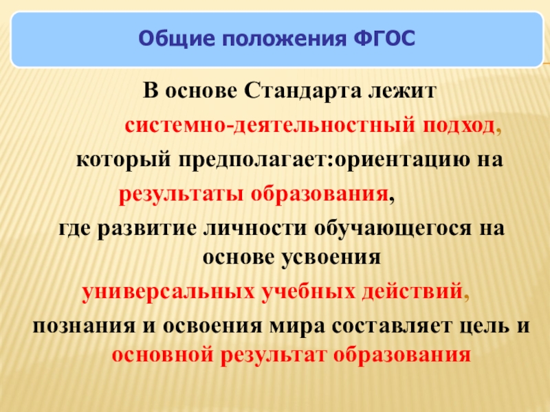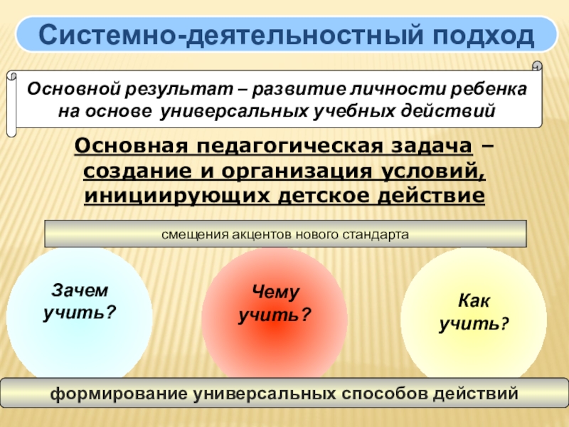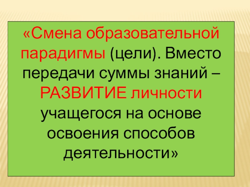 «Смена образовательной парадигмы (цели). Вместо передачи суммы знаний – РАЗВИТИЕ личности учащегося на основе освоения способов деятельности»