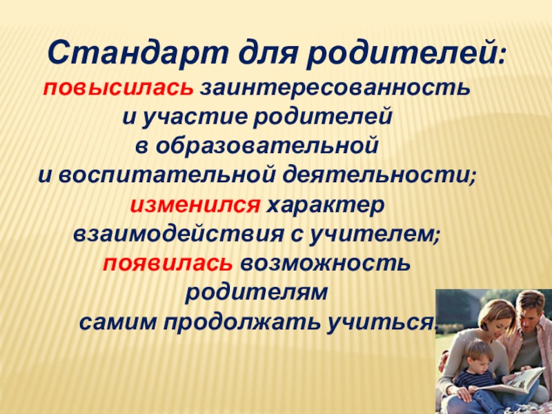 деятельности; изменился характер взаимодействия с учителем; появилась возможность родителям