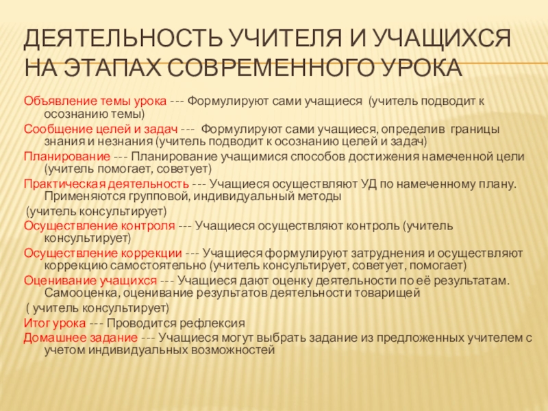 Слайд 32Деятельность учителя и учащихся на этапах современного урока