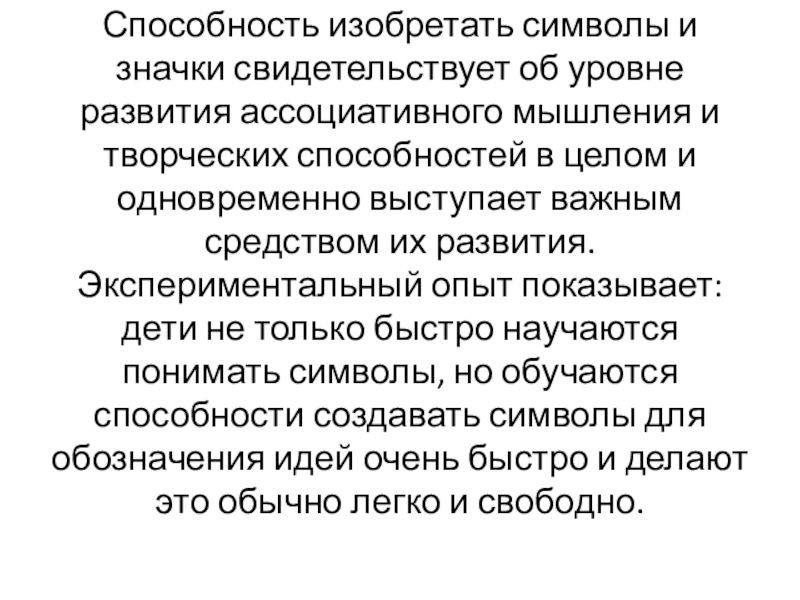 Экспериментальный опыт показывает: дети не только быстро научаются понимать символы, но обучаются способности создавать символы для обозначения идей очень быстро и делают это обычно легко и свободно.