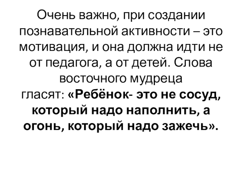 должна идти не от педагога, а от детей. Слова восточного мудреца гласят: «Ребёнок- это не сосуд, который надо наполнить, а огонь, который надо зажечь».