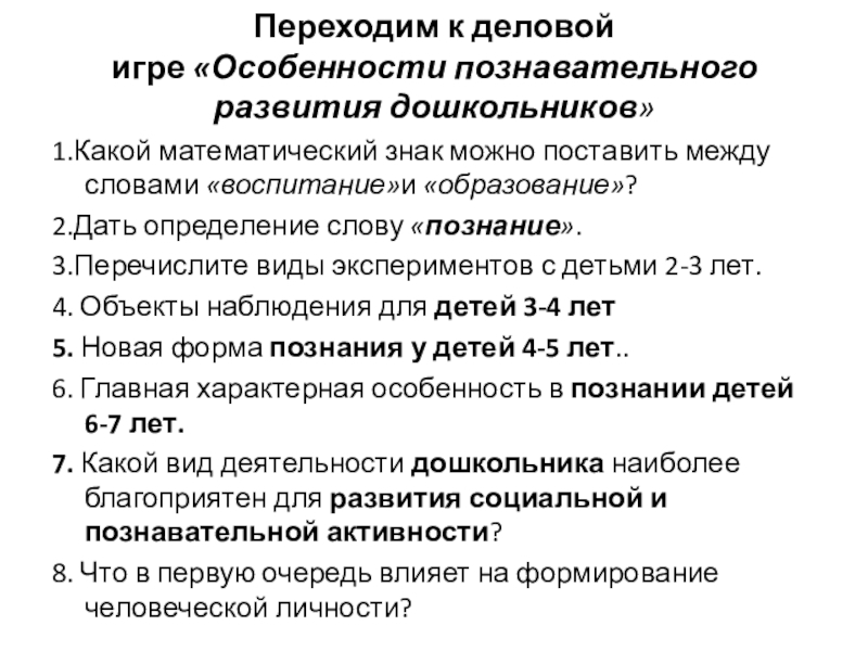 Переходим к деловой игре «Особенности познавательного развития дошкольников»
