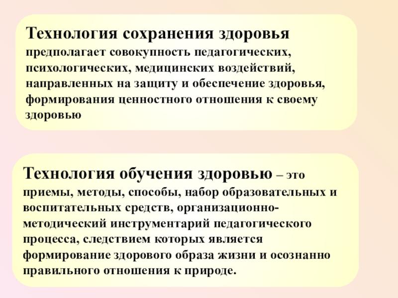 Технология обучения здоровью – это приемы, методы, способы, набор образовательных и воспитательных средств, организационно-методический инструментарий педагогического процесса, следствием которых является формирование здорового образа жизни и осознанно правильного отношения к природе.