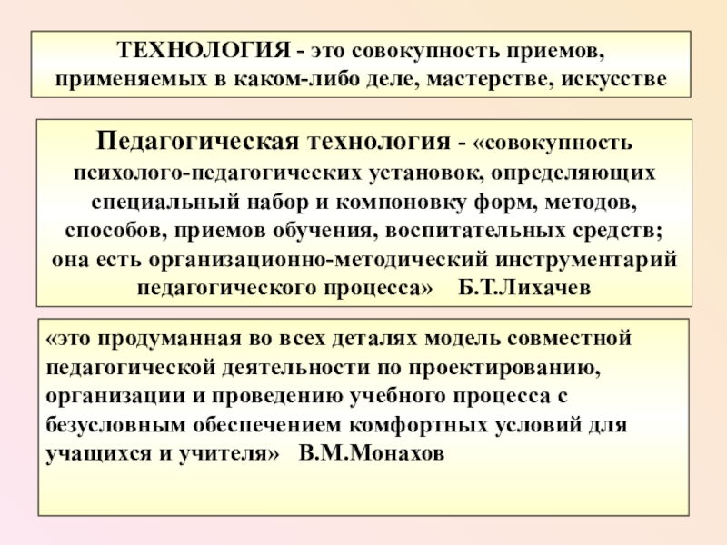 «это продуманная во всех деталях модель совместной педагогической деятельности по проектированию, организации и проведению учебного процесса с безусловным обеспечением комфортных условий для учащихся и учителя» В.М.Монахов