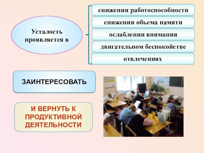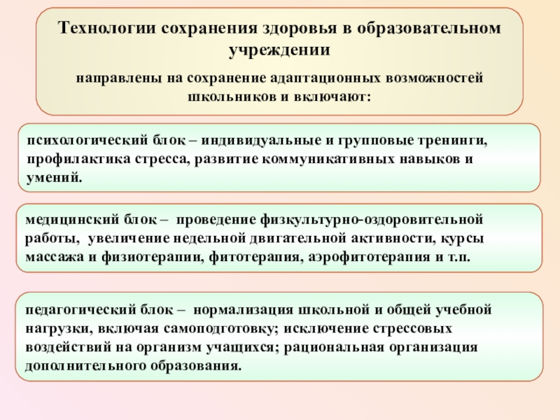 педагогический блок – нормализация школьной и общей учебной нагрузки, включая самоподготовку; исключение стрессовых воздействий на организм учащихся; рациональная организация дополнительного образования.