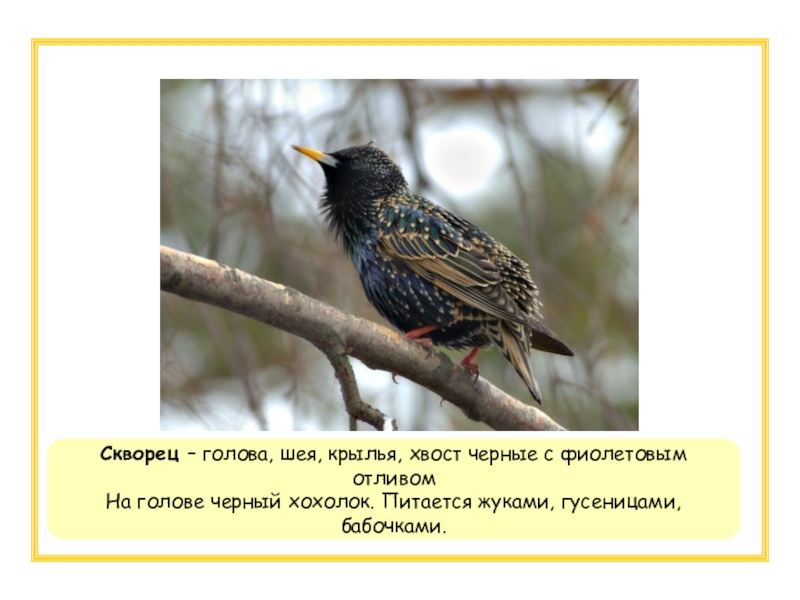 Скворец – голова, шея, крылья, хвост черные с фиолетовым отливомНа голове черный хохолок. Питается жуками, гусеницами, бабочками.