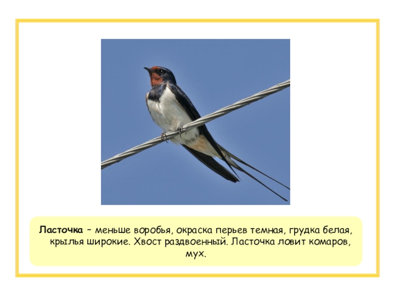 Ласточка – меньше воробья, окраска перьев темная, грудка белая,  крылья широкие. Хвост раздвоенный. Ласточка ловит комаров,