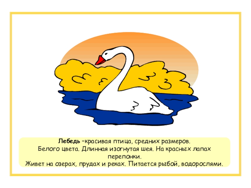 Лебедь –красивая птица, средних размеров.Белого цвета. Длинная изогнутая шея. На красных лапах перепонки. Живет на озерах, прудах