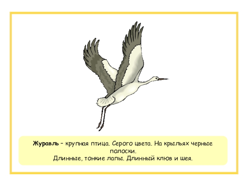 Журавль – крупная птица. Серого цвета. На крыльях черные полоски.Длинные, тонкие лапы. Длинный клюв и шея.