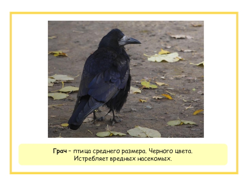 Грач – птица среднего размера. Черного цвета. Истребляет вредных насекомых.