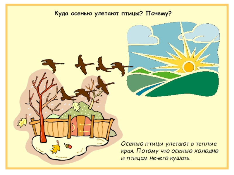 Осенью перелетные птицы улетают в теплые края. Потому что осенью холодно и птицам нечего кушать.