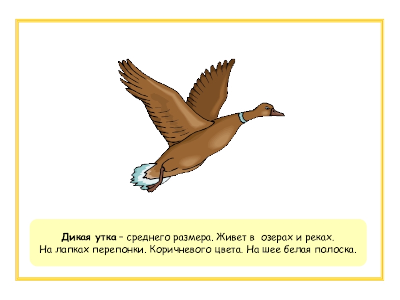 Дикая утка – среднего размера. Живет в озерах и реках. На лапках перепонки. Коричневого цвета. На шее