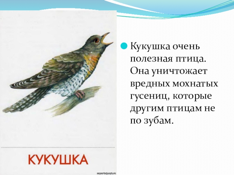 Слайд 10Кукушка очень полезная птица. Она уничтожает вредных мохнатых гусениц, которые другим