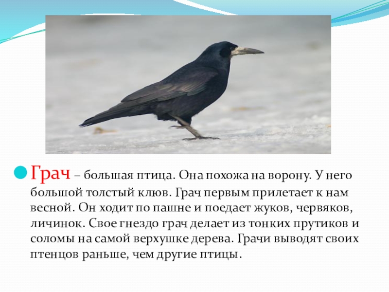 Грач – большая птица. Она похожа на ворону. У него большой толстый клюв. Грач первым прилетает к