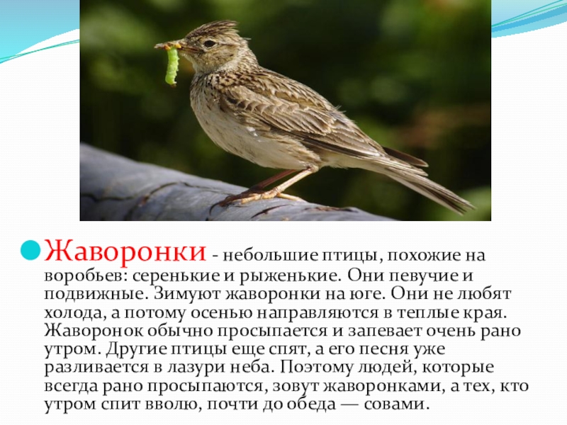 Жаворонки - небольшие птицы, похожие на воробьев: серенькие и рыженькие. Они певучие и подвижные. Зимуют жаворонки на юге. Они не любят холода, а потому осенью направляются в теплые края. Жаворонок обычно просыпается и запевает очень рано