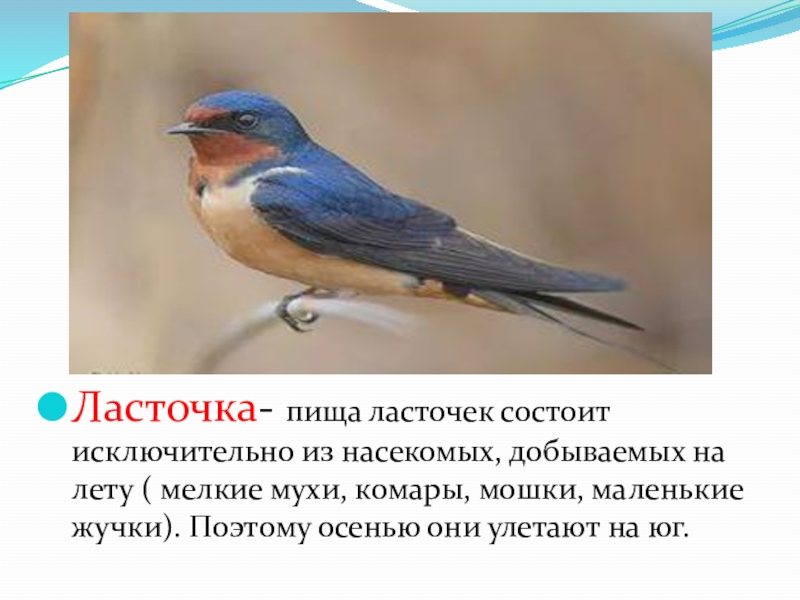 Слайд 9Ласточка- пища ласточек состоит исключительно из насекомых, добываемых на лету (