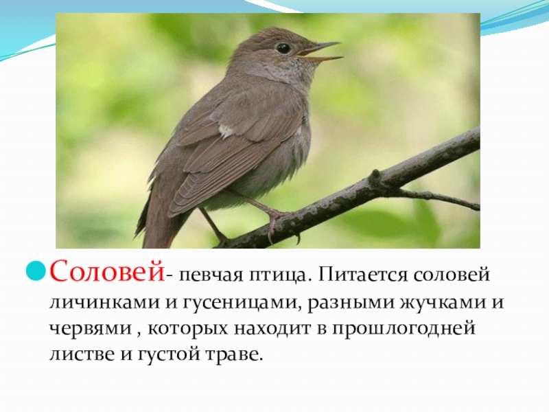 Слайд 8Соловей- певчая птица. Питается соловей личинками и гусеницами, разными жучками и