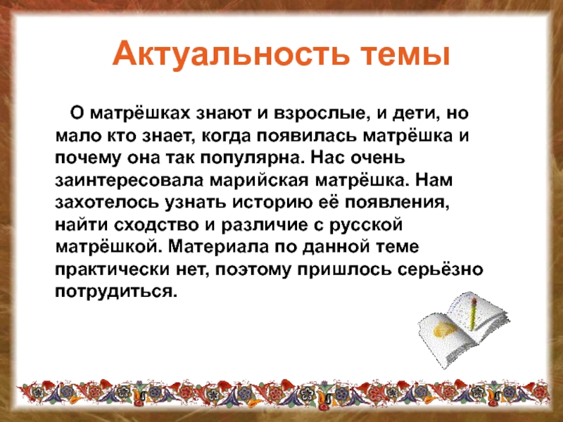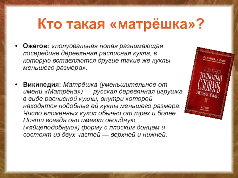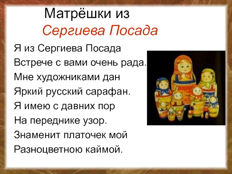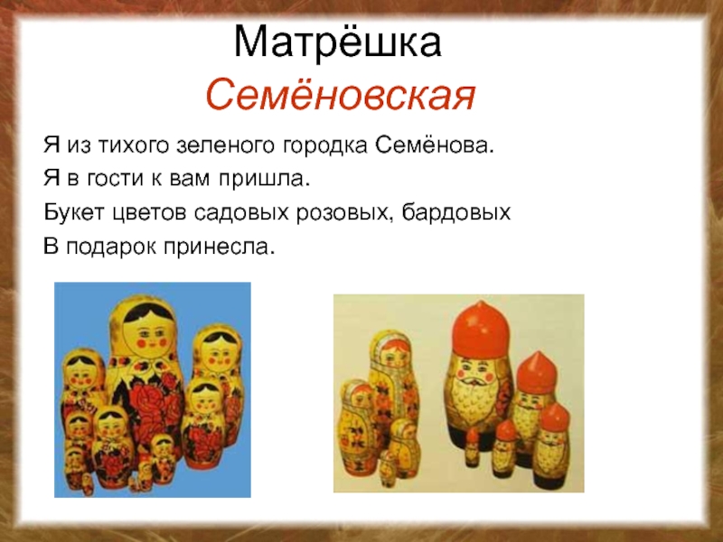 Матрёшка - самый популярный русский сувенир. Широкую славу завоевала она далеко за рубежом. Перевод слова "Матрешка" нельзя найти ни в одном словаре мира. Но эту деревянную куклу знают все.