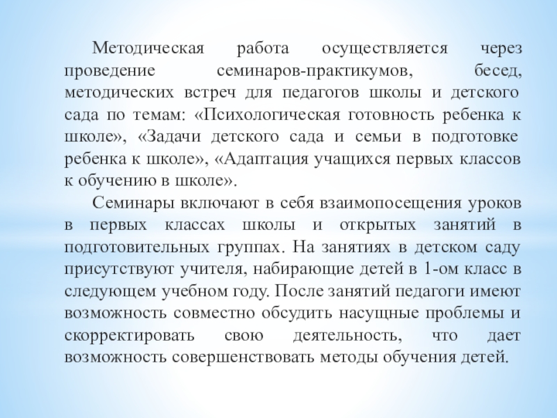 Семинары включают в себя взаимопосещения уроков в первых классах школы и открытых занятий в подготовительных группах. На занятиях в детском саду присутствуют учителя, набирающие детей в 1-ом класс в следующем учебном году. После занятий педагоги имеют возможность совместно обсудить насущные проблемы и скорректировать свою деятельность, что дает возможность совершенствовать методы обучения детей.