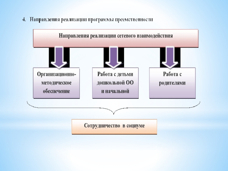 Третье направление предусматривает организацию совместной деятельности педагогов дошкольной группы, школы и родителей, объединение усилий, что способствует эффективному налаживанию плодотворного сотрудничества. Воспитатели и родители вместе организуют и проводят творческие конкурсы, праздники, экскурсии в библиотеку и школьный музей, собрания для родителей. Взаимодействие образовательных учреждений осуществляется по разработанному плану преемственности воспитательно-образовательного процесса
