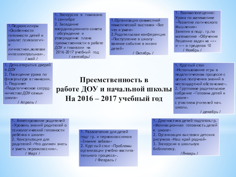 Поэтому для этих образовательных учреждений отправной точкой для разработки плана-проекта должен стать итоговый педагогический совет , где педагогические кадры, старший воспитатель дошкольного отделения и завуч начальной школы обсуждают, корректируют и утверждают мероприятия на год.