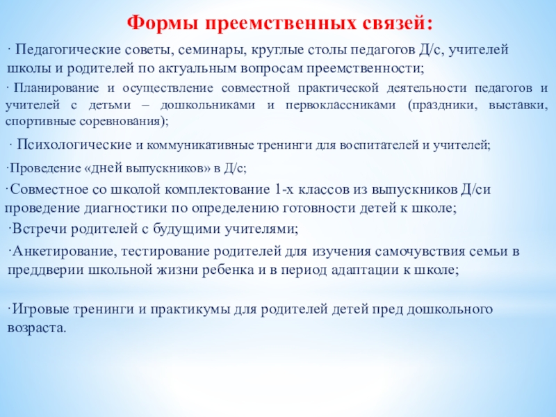 формы сотрудничества по преемственности в работе дошкольного образовательного учреждения и школы