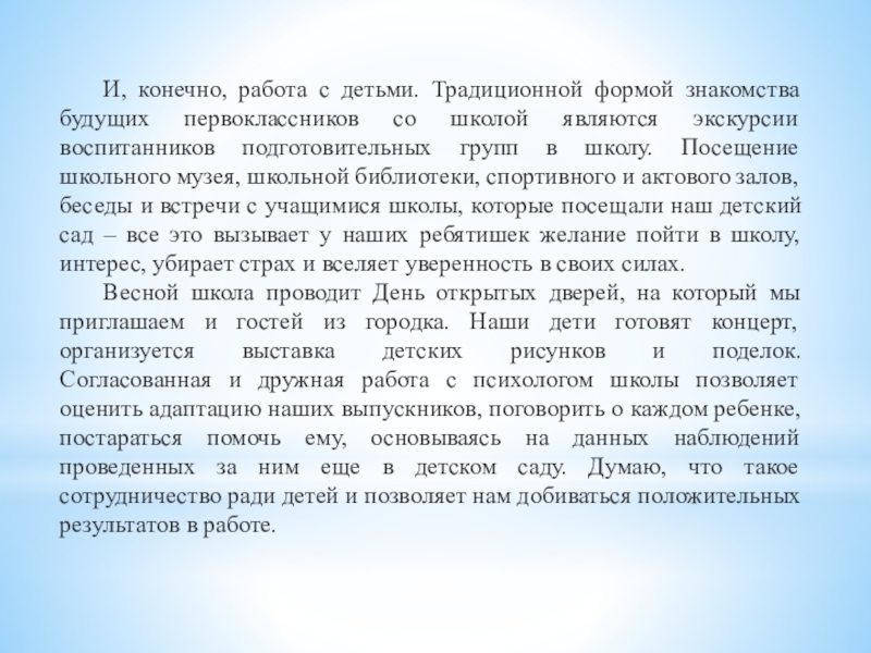 Согласованная и дружная работа с психологом школы позволяет оценить адаптацию наших выпускников, поговорить о каждом ребенке, постараться помочь ему, основываясь на данных наблюдений проведенных за ним еще в детском саду. Думаю, что такое сотрудничество ради детей и позволяет нам добиваться положительных результатов в работе.