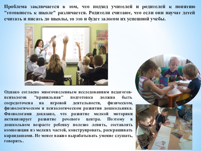 "готовность к школе" различается. Родители считают, что если они научат детей считать и писать до школы, то это и будет залогом их успешной учебы.