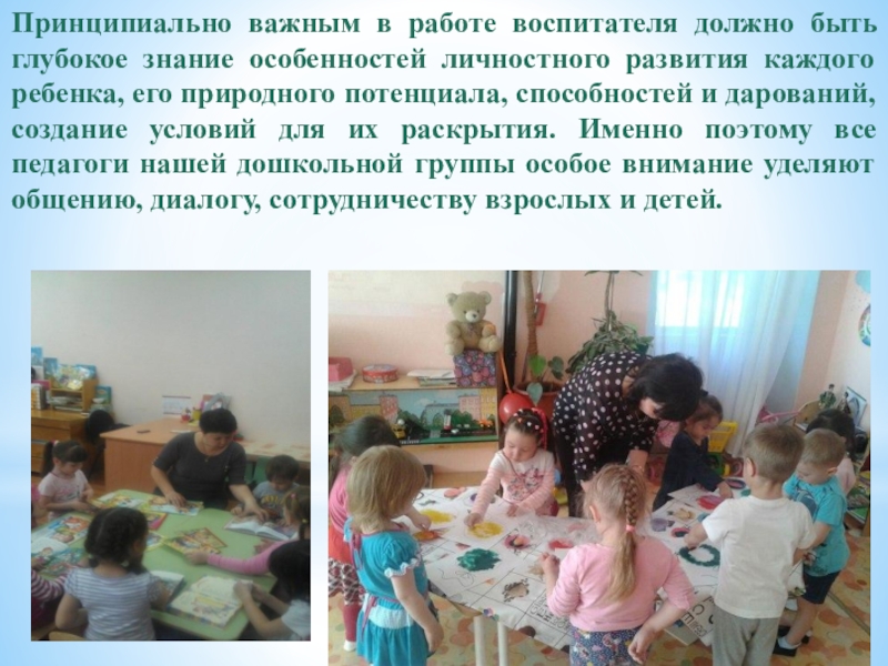 развития каждого ребенка, его природного потенциала, способностей и дарований, создание условий для их раскрытия. Именно поэтому все педагоги нашей дошкольной группы особое внимание уделяют общению, диалогу, сотрудничеству взрослых и детей.
