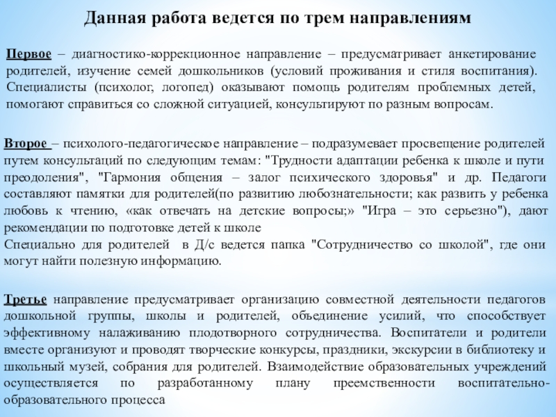 Слайд 20Первое – диагностико-коррекционное направление – предусматривает анкетирование родителей, изучение семей дошкольников