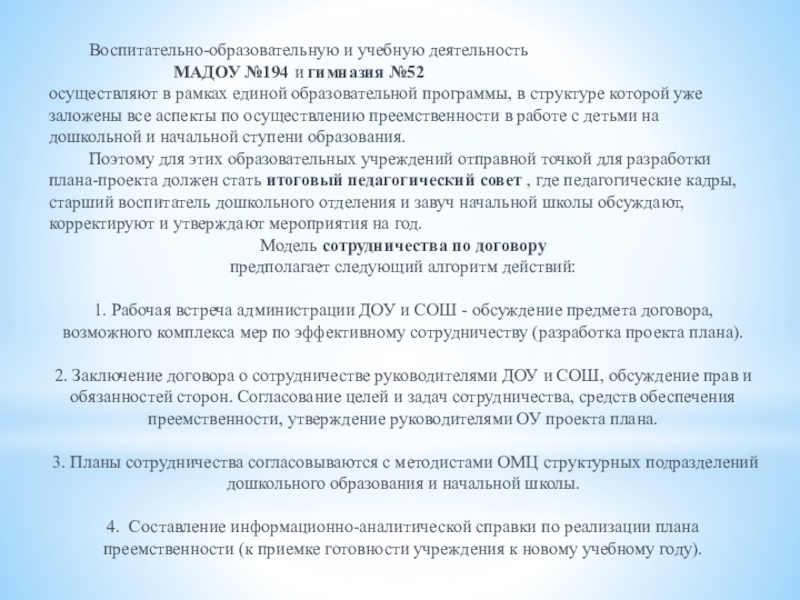 Составление проекта совместной деятельности по обеспечению преемственности;