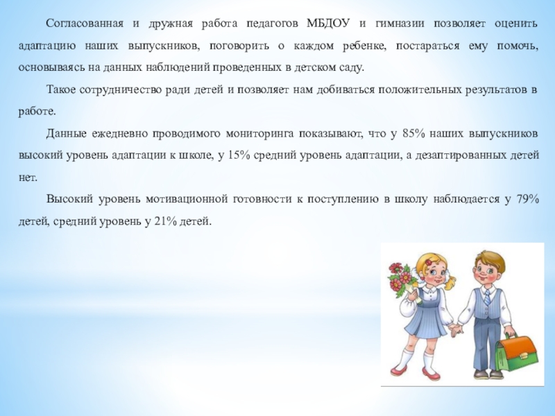 Слайд 33Согласованная и дружная работа педагогов МБДОУ и гимназии позволяет оценить адаптацию