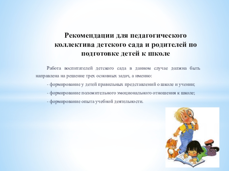 Слайд 32Рекомендации для педагогического коллектива детского сада и родителей по подготовке детей