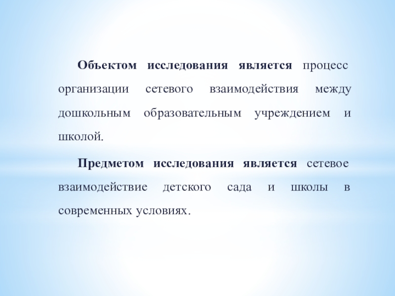 Слайд 5Объектом исследования является процесс организации сетевого взаимодействия между дошкольным образовательным учреждением