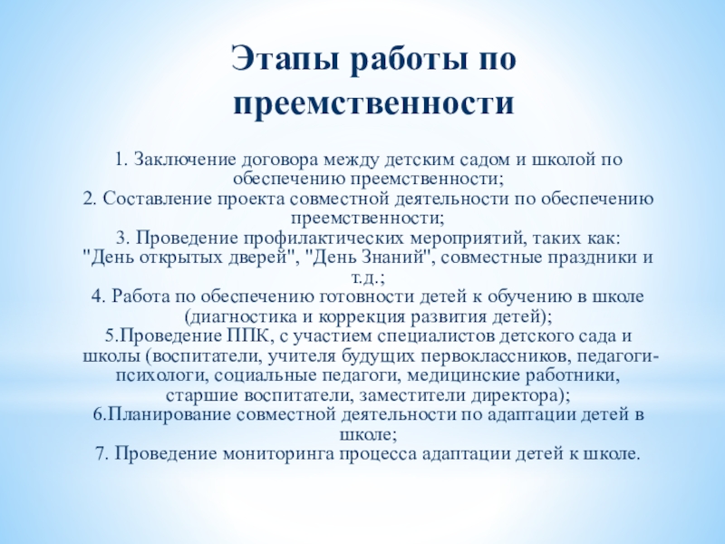 Слайд 181. Заключение договора между детским садом и школой по обеспечению преемственности;