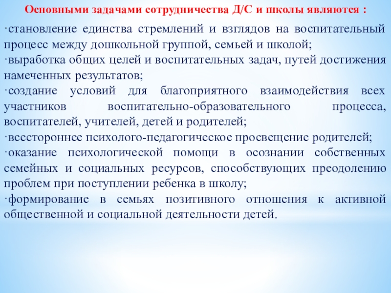 Слайд 19Основными задачами сотрудничества Д/С и школы являются :