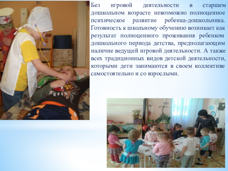 Слайд 15Без игровой деятельности в старшем дошкольном возрасте невозможно полноценное психическое развитие