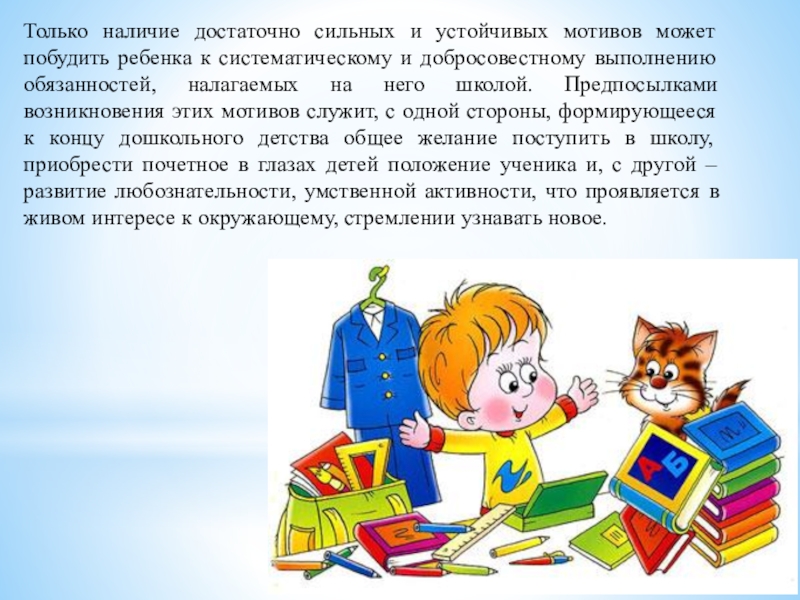 систематическому и добросовестному выполнению обязанностей, налагаемых на него школой. Предпосылками возникновения этих мотивов служит, с одной стороны, формирующееся к концу дошкольного детства общее желание поступить в школу, приобрести почетное в глазах детей положение ученика и, с другой – развитие любознательности, умственной активности, что проявляется в живом интересе к окружающему, стремлении узнавать новое.