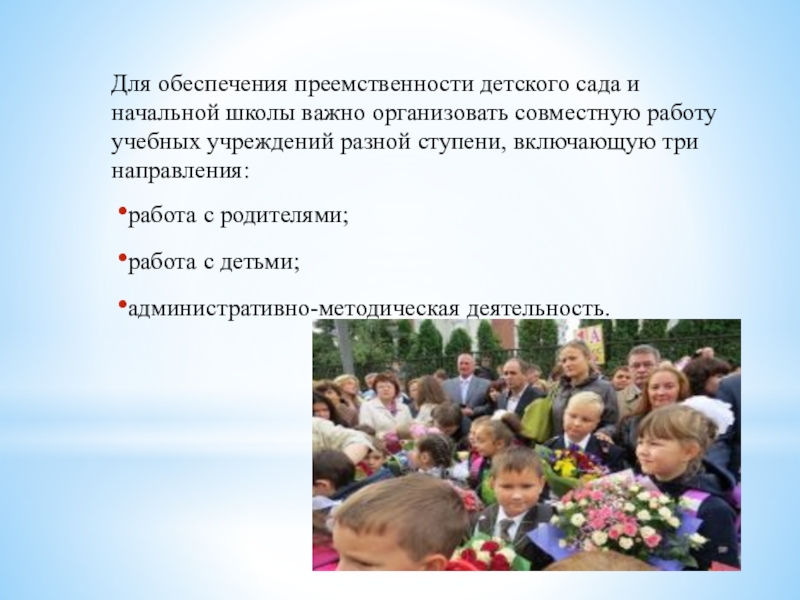 Слайд 12Для обеспечения преемственности детского сада и начальной школы важно организовать совместную