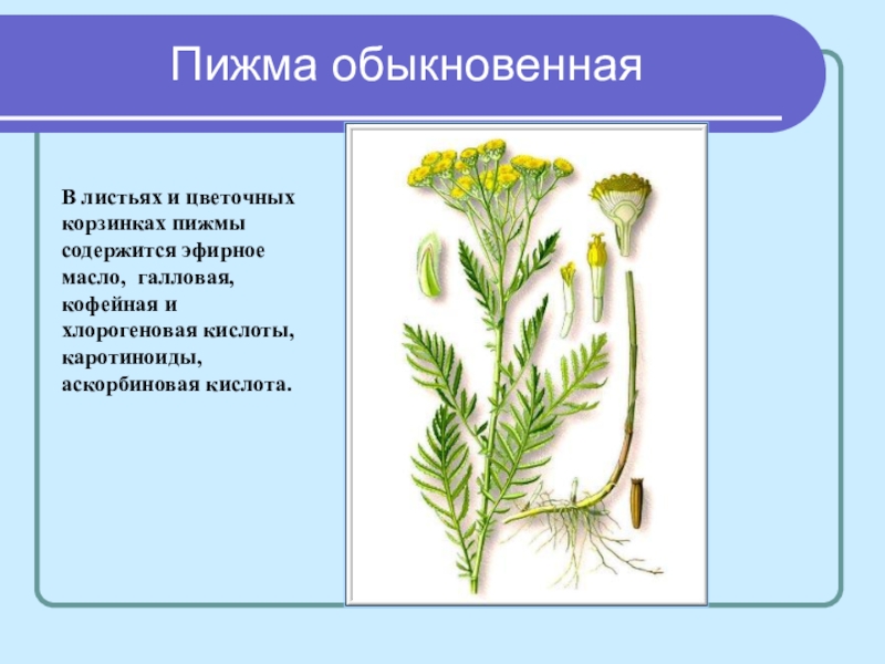 В листьях и цветочных корзинках пижмы содержится эфирное масло, галловая,
