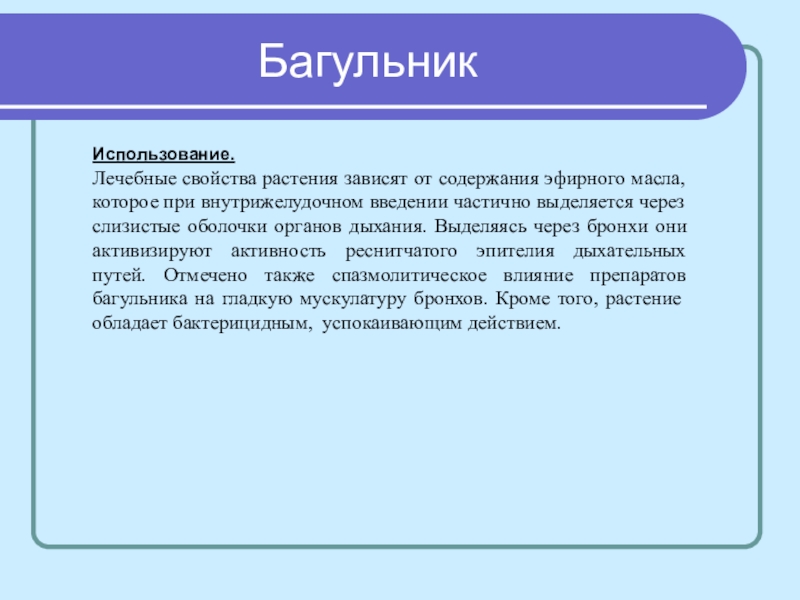 введении частично выделяется через слизистые оболочки органов дыхания. Выделяясь через бронхи они активизируют активность реснитчатого эпителия дыхательных путей. Отмечено также спазмолитическое влияние препаратов багульника на гладкую мускулатуру бронхов. Кроме того, растение обладает бактерицидным, успокаивающим действием.