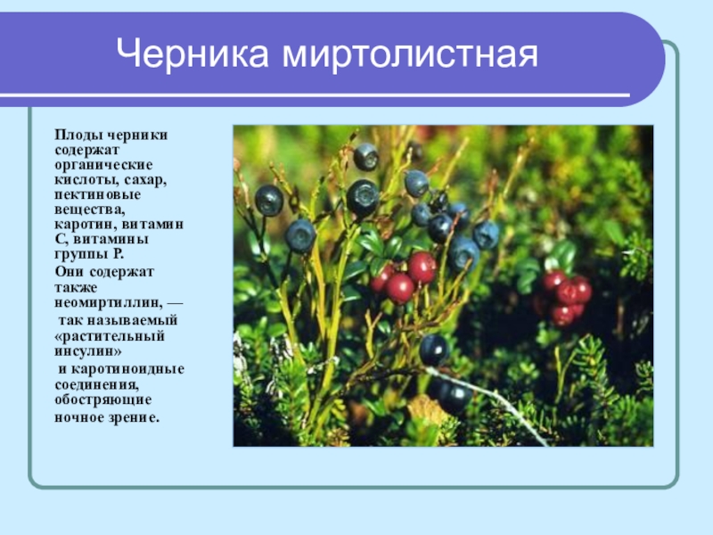 Плоды черники содержат органические кислоты, сахар, пектиновые вещества, каротин, витамин