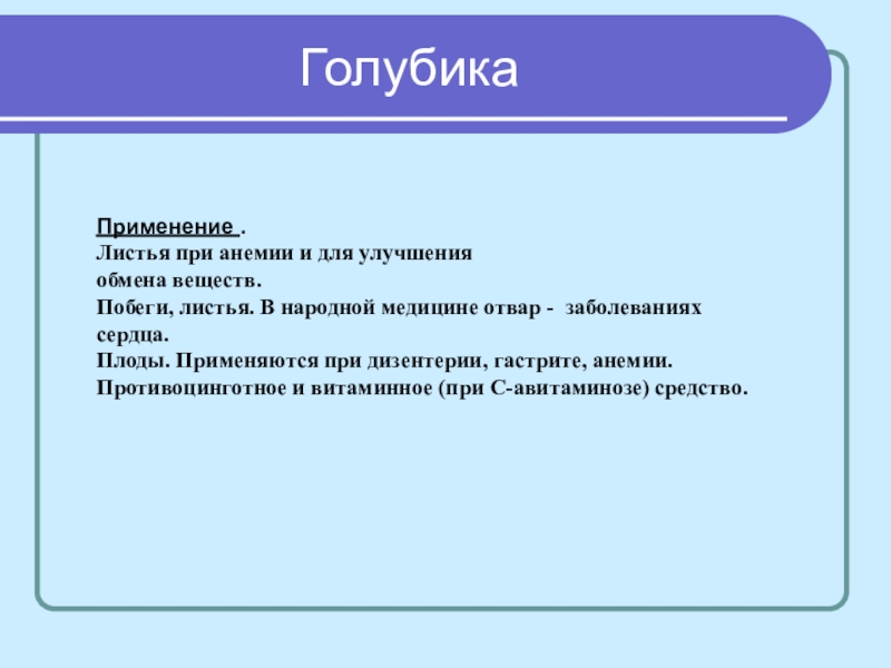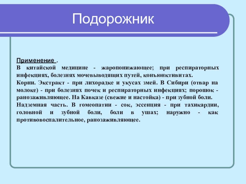 В китайской медицине - жаропонижающее; при респираторных инфекциях, болезнях мочевыводящих