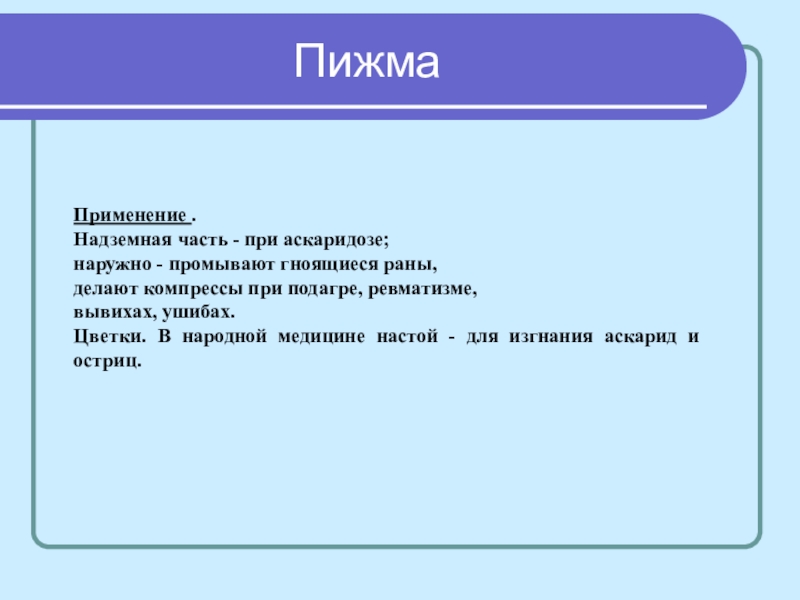 Цветки. В народной медицине настой - для изгнания аскарид и остриц.