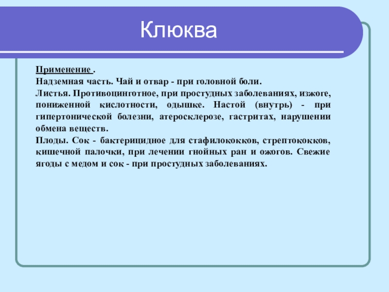 Плоды. Сок - бактерицидное для стафилококков, стрептококков, кишечной палочки, при лечении гнойных ран и ожогов. Свежие ягоды с медом и сок - при простудных заболеваниях.