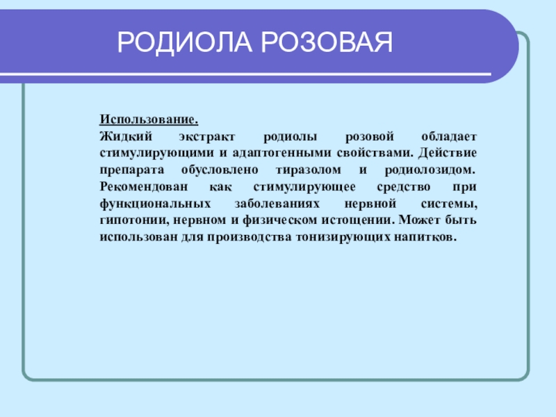 Действие препарата обусловлено тиразолом и родиолозидом. Рекомендован как стимулирующее средство при функциональных заболеваниях нервной системы, гипотонии, нервном и физическом истощении. Может быть использован для производства тонизирующих напитков.
