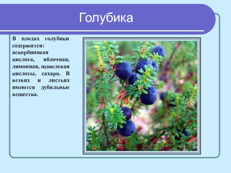 В плодах голубики содержится: аскорбиновая кислота, яблочная, лимонная, щавелевая кислоты, сахара.